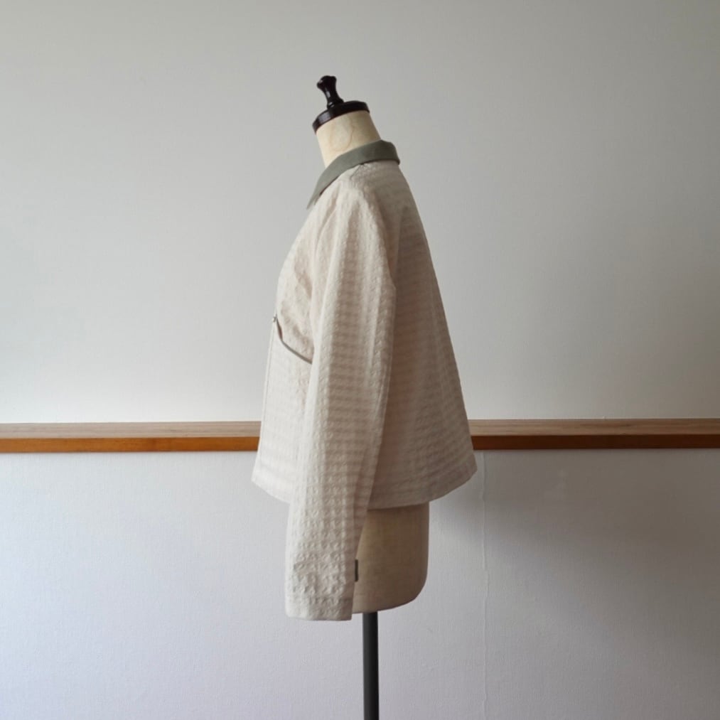 シンプルなフォルムの軽やかなジャッケットに様々な素材感やディティールを詰め込みました。
