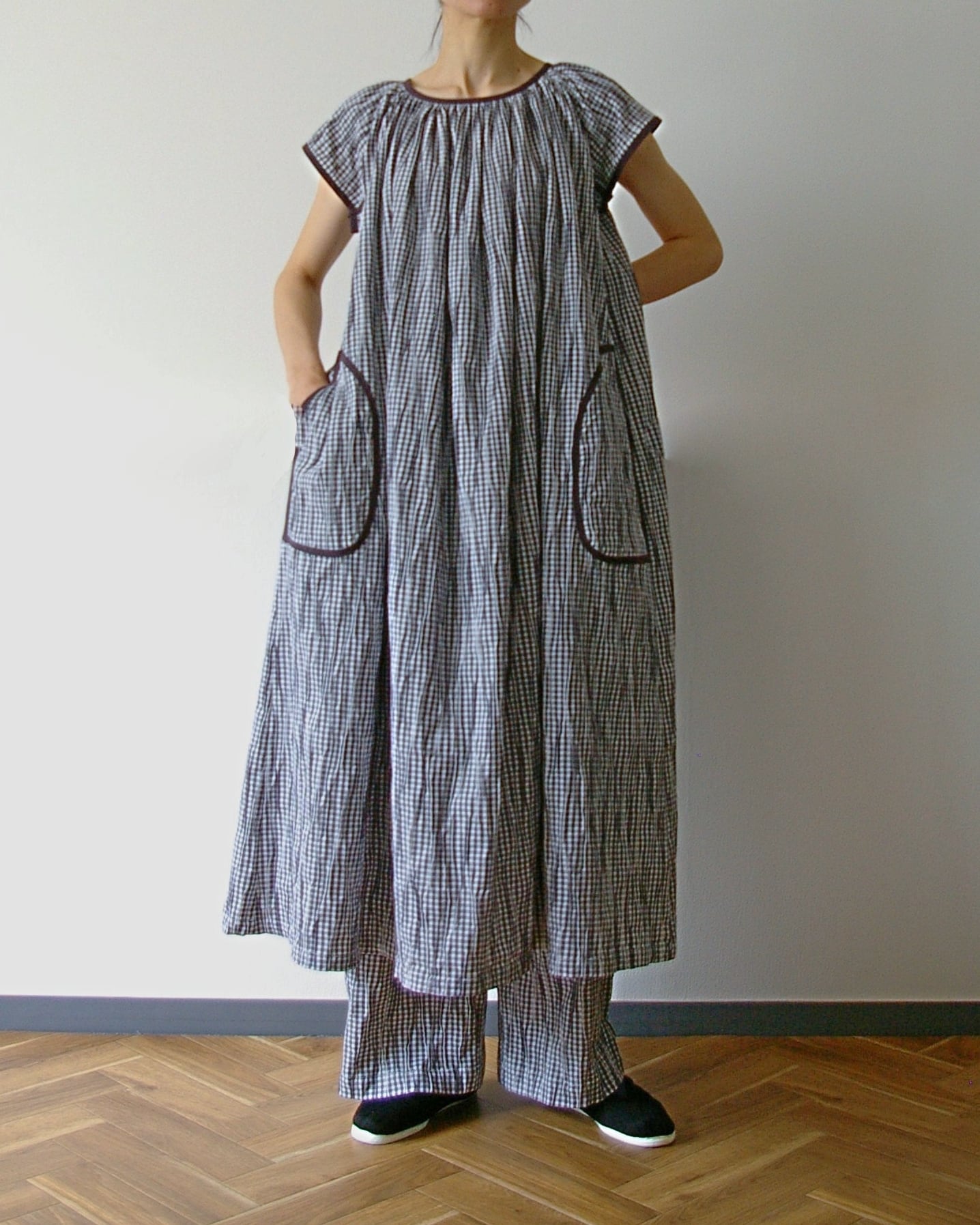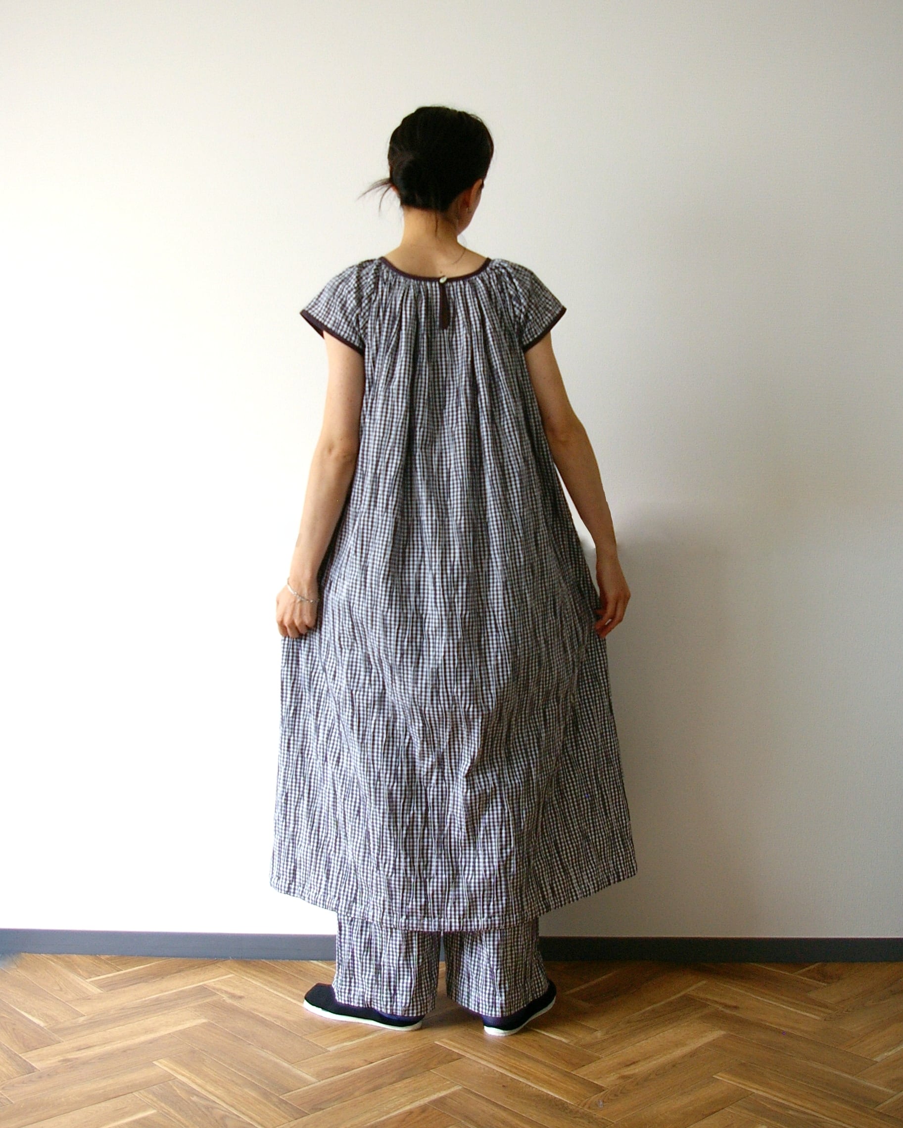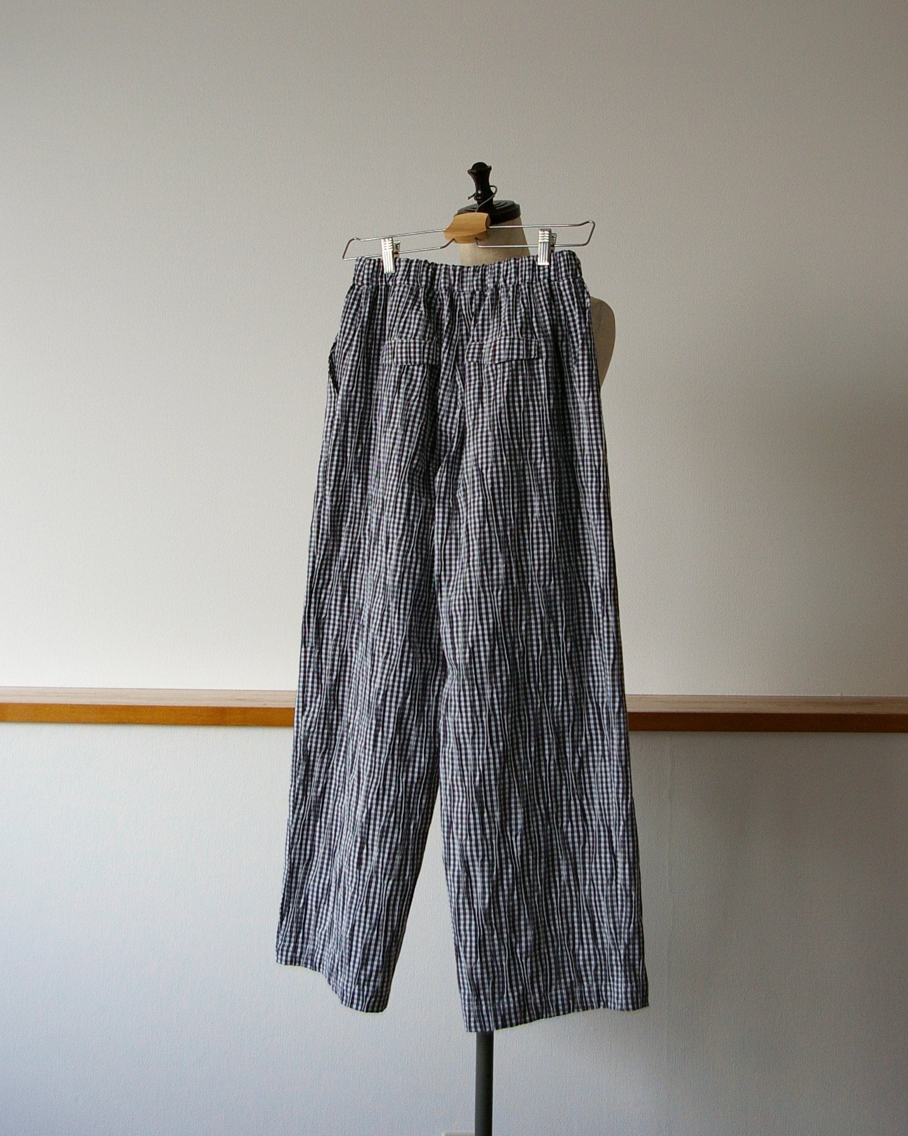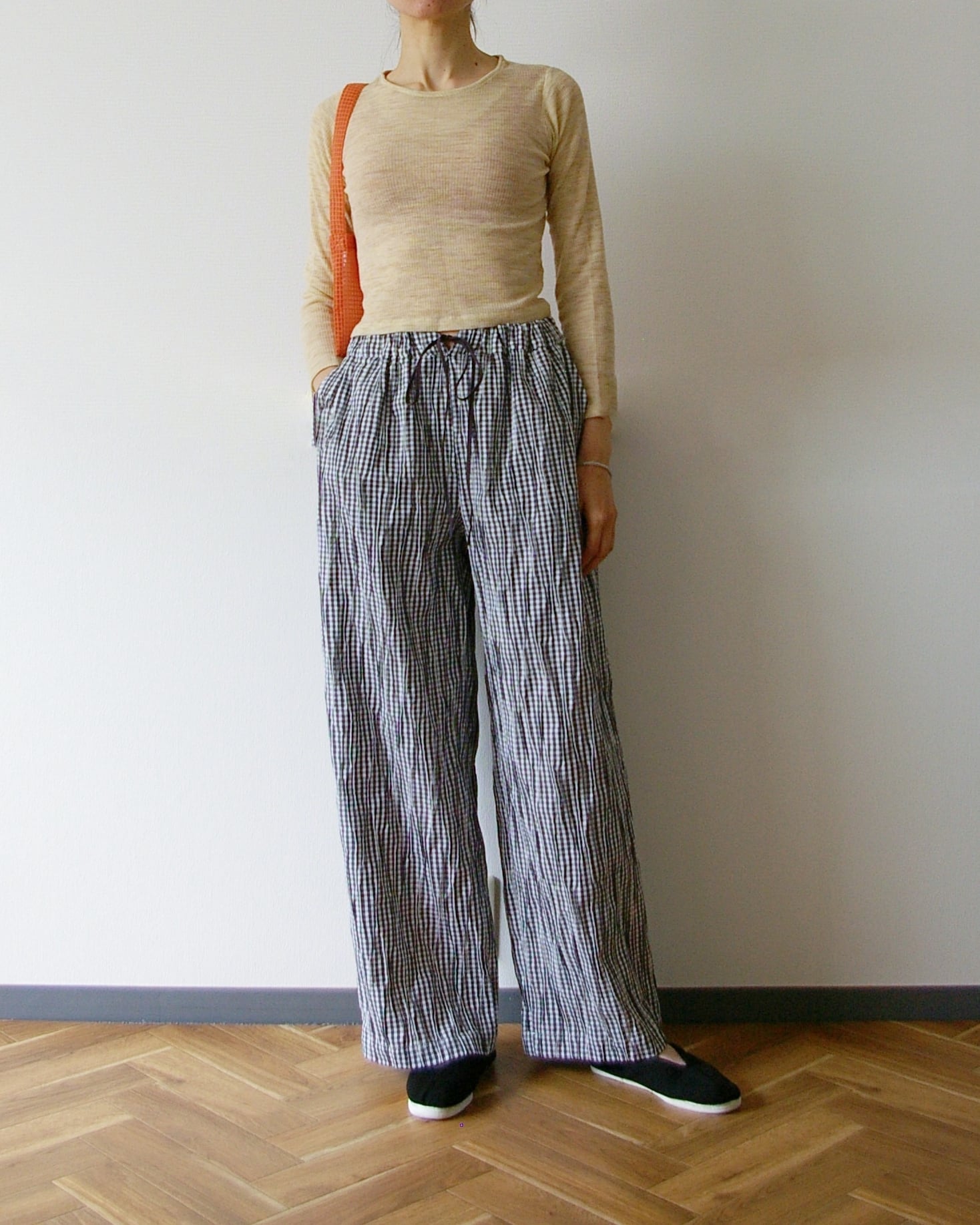 ウエストはゴム入りで楽ちんです。フロントの飾り紐をポイントに。